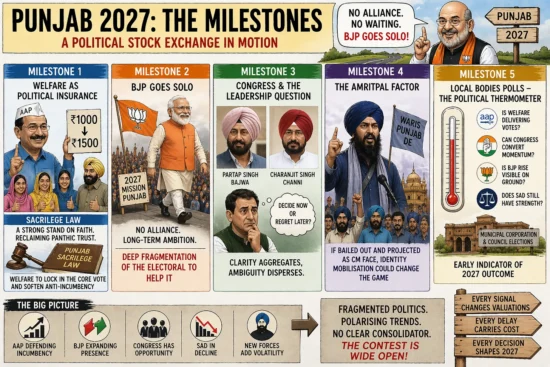 AAP, meanwhile, despite its sharp drop, is not out of the game. A fall from 42% to ~26% is significant—but it still represents a large base. With welfare measures and its recent positioning on sacrilege law, the party is clearly attempting to reclaim the panthic space it lost.The fourth milestone lies outside conventional politics. If Amritpal Singh secures bail or parole and is projected as a Chief Ministerial face, Punjab could see intensified identity mobilisation, further complicating electoral arithmetic.The fifth milestone will be the upcoming municipal corporation and council elections. These will act as a political thermometer, indicating whether welfare, polarisation, or leadership clarity is actually translating into ground support.
