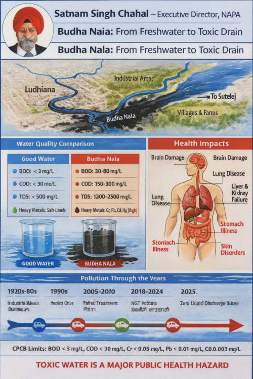 Budha Nala in Ludhiana represents one of the most severe cases of urban and industrial water pollution in Punjab. What was once a natural freshwater stream has gradually been transformed into a carrier of untreated industrial effluents and municipal sewage. The contamination of Budha Nala is not only visible in its dark color and foul odor but is scientifically evident in its chemical composition, which stands in sharp contrast to the parameters of clean and safe water. This toxic transformation has had serious and long-lasting consequences for human health, animal life, agriculture, and the surrounding ecosystem.