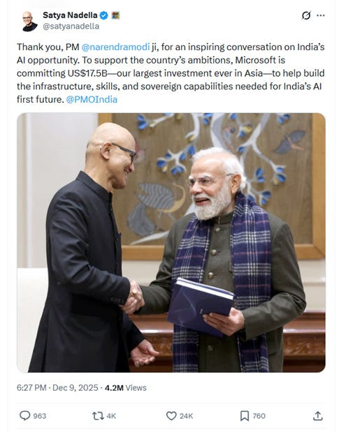 “To support the country’s ambitions, Microsoft is committing US$17.5B—our largest investment ever in Asia—to help build the infrastructure, skills, and sovereign capabilities needed for India’s AI first future,” Nadella wrote in an X post.