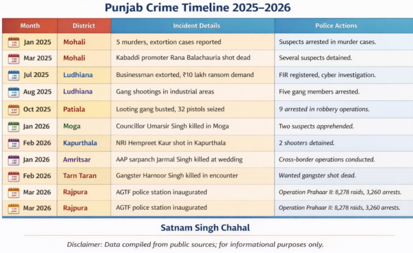 Punjab’s crime situation in 2025–2026 reflects a multipronged threat: local gang rivalries spilling into lethal violence, transnational organized crime influence, digital extortion tactics, and periodic mass police operations. While enforcement actions show strong resolve and measurable outcomes, the persistence of targeted killings and extortion attempts signals that systemic challenges remain. Continued public cooperation, cross‑border policing collaboration, and intelligent use of technology will be essential to reduce crime and restore public confidence across the state.