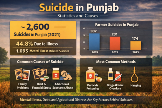 Suicide remains a significant public health and social concern in Punjab, shaped by a complex interplay of mental health issues, chronic illness, economic stress, and social pressures. According to the National Crime Records Bureau (NCRB) data for 2021, the state recorded about 2,600 suicides — a figure that reflects both persistent distress and the limitations of official reporting systems.