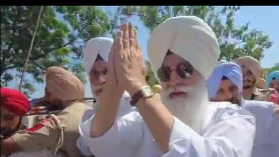 Radha Soami Satsang Beas spiritual head Baba Gurinder Singh Dhillon greets followers after meeting Shiromani Akali Dal leader Bikram Singh Majithia at Nabha jail on Tuesday.