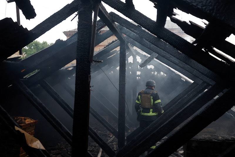A firefighter on a roof of a damaged apartment building in Kyiv, Ukraine, July 10, 2025. REUTERS/Valentyn Ogirenko